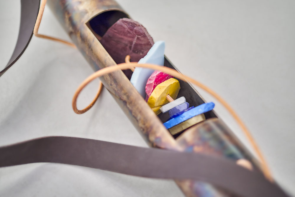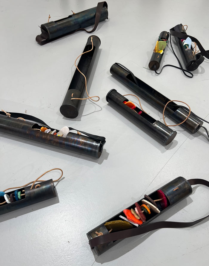 RG : L’idée de déplacement et de portabilité est très présente dans l’exposition. Je pense aux pièces Les déracinés (vasculum), inspirées des tubes utilisés par les botanistes pour transporter des échantillons, ou Les témoins, ces formes monumentales sur roues. Peut-on lire cette portabilité comme une métaphore de la vie des immigrés — toujours en mouvement, toujours entre deux lieux?
