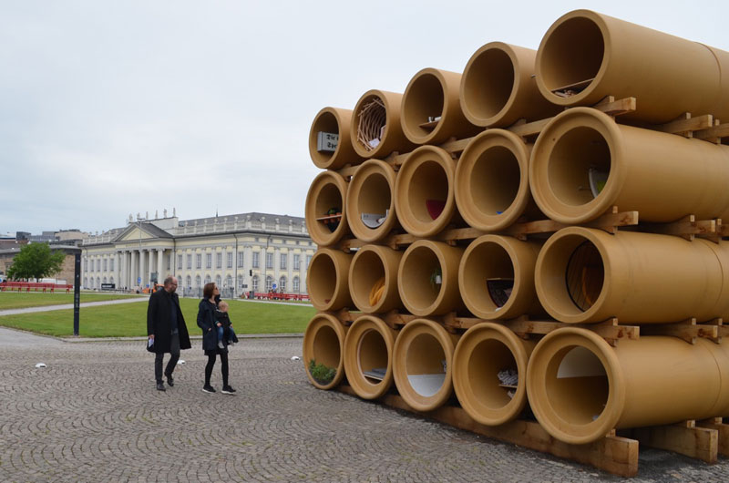 Em Kassel, o ambiente é outro. Nesta próspera cidade de 200 000 habitantes, autointitulada "Cidade-Documenta", reina um espírito festivo. A população alegra-se por estar no centro da atenção mediática e turística (900.000 visitas na última edição e uma expectativa de mais de 1 milhão de visitantes este ano). Em Berlim, uma mega-exposição deste tipo perder-se-ia completamente no meio da trasbordante atividade da capital alemã. Aqui não. Tal como Münster (que inaugurou este mês uma ótima edição dos seus "Skulptur Projekte"), Kassel é mais um exemplo de um extraordinário sucesso popular e internacional, fruto de um metódico planeamento a longo prazo e da continuidade exemplar das políticas culturais a nível local e nacional. O crescente apoio das empresas locais e internacionais vêm completar o quadro e contribuir para este inegável triunfo da província sobre cidades e regiões teoricamente mais ricas e fortes. Certamente difícil de repetir noutros países este mega-sucesso é uma lição para cidades e regiões periféricas que queiram entrar (e ficar) nos grandes circuitos culturais ao nível internacional.