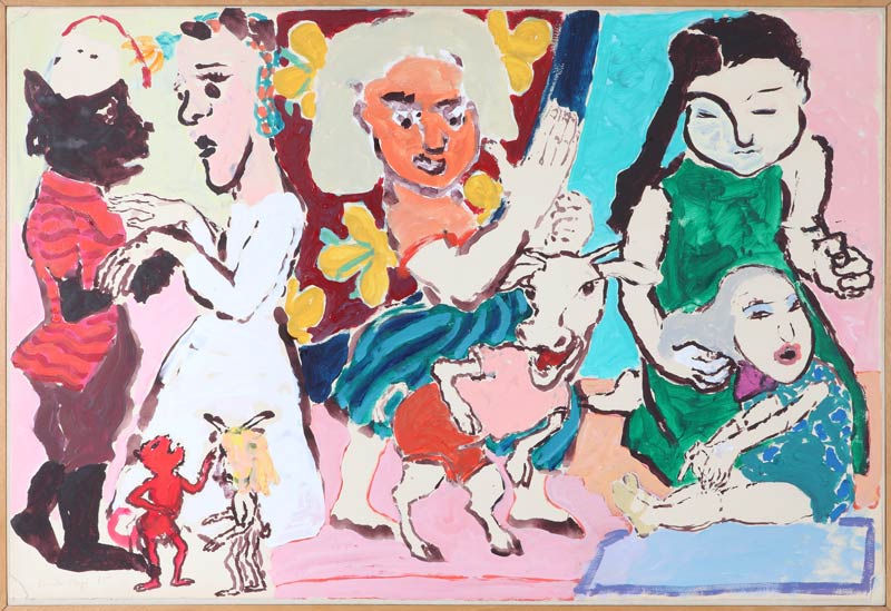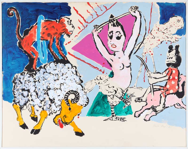 2018, foi um ano de exposições marcantes da obra de Paula Rego, nomeadamente, a retrospectiva "Les contes cruels de Paula Rego", no Musée de l'Orangerie em Paris (17 out 2018 a 14 jan 2019), e "Paula Rego: Anos 80", na Casa das Histórias em Cascais (13 dez 2018 a 26 de maio 2019), duas exposições notáveis, que me suscitaram uma nova interpretação crítica da sua obra! Ficou-me claro que Paula Rego combina o imaginário das fábulas e narrativas das histórias com as suas aventuras pessoais: Paula inspira-se na leitura de contos admiráveis da literatura universal e no jogo real da história pessoal. Ficou-me igualmente claro que as diferentes práticas que a artista foi experimentando ao longo das inúmeras obras que foi criando e que se traduziram em reformulações do seu processo de trabalho, são parte do universo narrativo das obras e do tratamento formal das personagens ao mesmo tempo que estabelecem a distinção entre colagem, pintura e desenho na obra da Paula Rego. Retrospectivamente, Paula Rego, trabalhou a colagem nos anos 70, e a pintura a acrílico nos anos 80. Nos anos 1990, a artista caracteriza-se pelo desenho em pastel: o lugar da pintura e do desenho não é o mesmo. A partir de 1994, Paula Rego reorientou a prática da pintura para preferir desenhar a pastel, "Com o pastel, é um trabalho de superposição, com camadas que evoluem constantemente", numa técnica viragem de práticas da tinta para o pastel. O princípio da liberdade absoluta da pintura dos anos 80 tornou-se progressivamente numa obra académica ao encontro do desenho a pastel e da narração formal! Talvez a decisão de Paula Rego fosse apropriada para o momento: a artista revela o que encontra e a atrai no pastel, "Com o pastel, não há pincel entre ti e a superfície. A mão cria o desenho. É virtualmente escultura. Tu crias realmente a personagem". Fosse qual fosse a razão, a verdade é que no pastel as personagens falam mais alto do que a pintura. A linguagem da pintura falava mais alto do que as personagens: era o irracional quem dava forma às personagens: mais do que Paula Rego dominar as personagens, as personagens eram dominadas pela pintura. Nos anos 80 a pintura é primordial às personagens! E o segredo das obras dos anos 80 reside precisamente na pintura, na sua energia, no seu tipo específico de energia. A energia da tinta com respeito à pintura de Paula Rego não encontra paralelo no pastel literalmente algo de académico (são as questões da forma que se tornam predominantes)! O pastel nunca é fluido nem improvisado, mas antes algo de fixo. Na Paula Rego dos anos 80 há o vínculo à pintura: a tinta carrega de energia, movimento e intensidade, as pinturas da artista marcadas por uma emoção sem limites, que termina com os primeiras obras a pastel em 1994. E assim se passaram as coisas - é por isso que na obra da Paula Rego me interessa especialmente o ponto de vista da pintura dos anos 80, de uma construção livre das formas: tecnicamente a tinta é um material líquido, permite construir as formas livremente, reforçar a estrutura emocional das historias, ao contrário do pastel (óleos espessos e secos). Neste período a obra da Paula Rego tornou-se numa projecção da psique com acentos autobiográficos; a artista combina em si uma multiplicidade de personagens; desenvolveu a ideia de um paralelismo entre a vida humana e o mundo animal e vegetal simbolicamente associados a características morais, virtudes e vícios próprios da natureza humana! Os bichos são criaturas com qualidades e adoptam comportamentos humanos e as pessoas animalescas, criando um universo de complexidade psicológica e ambíguo. Animais, plantas e pessoas são pensados alegoricamente / metaforicamente na sua composição, o que lhe permite contar histórias de uma forma mais directa e regressar à infância. Quando olhamos para as inúmeras personagens envolvidas nas suas pinturas, como de um teatro de máscaras usadas no teatro grego, a artista revela toda a teatralidade do antigo paganismo - a vida é um teatro e a artista a dramaturga; neste aspecto pode dizer-se que Paula Rego encontrou maneira (no início dos anos 80) de estabelecer uma nova linguagem conceptual, criadora de metamorfoses - a metamorfose é o núcleo imaginativo de todo o conceito. A essência é o processo não é o objecto de arte -, um visível desejo proteico de viver e sentir. Paula Rego trata a história contemporânea como alegoria, em busca de transformações mágicas - de humanos em animais e vice-versa. As pinturas tornam-se vivas, orgânicas, têm estados de espírito! Tudo nela flui, pensamento, pintura, acção. É o caso destas duas obras, de título desconhecido (representadas em anexo), de 1984, em que a pintora explora uma metodologia muito simples, de enorme liberdade criativa, totalmente deliberada. A artista utiliza uma combinação de luxuria, temor, anseio, sexo e a metamorfose - sublime perversidade? Porque onde está o esplendor dos seres híbridos também está, na totalidade, a sua perversidade -, para desafiar as formas do clássico da moral, da autoridade e da harmonia. As figuras das pinturas são delineadas a tinta preta para depois preencher a sua superfície com uma enorme diversidade de tintas de cor. O macaco é simbolizado pelo vermelho: há uma dialéctica entre vermelho e macaco. O vermelho carnal representa emoção, sexo, a vida do corpo aqui e agora. O macaco é o marido de Paula Rego. A obediente Paula Rego tem que se submeter. A pintura dos anos 80 da Paula Rego é um exercício do olhar para dentro; é da vida pessoal da Paula Rego que se trata, a artista a representar-se a ela com crueza e ironia; pensamentos de histórias familiares, da vida conjugal, ou sentimentos, a paixão, o ciúme, a infidelidade, a vingança, são temas que a artista vai criando através de encenações. É possível que o observador não se aperceba do significado das personagens e da descrição dos 