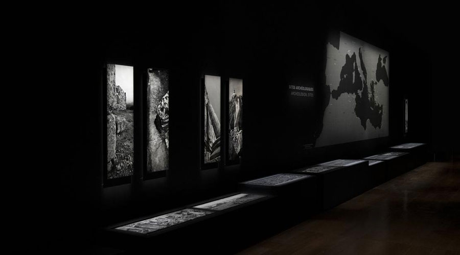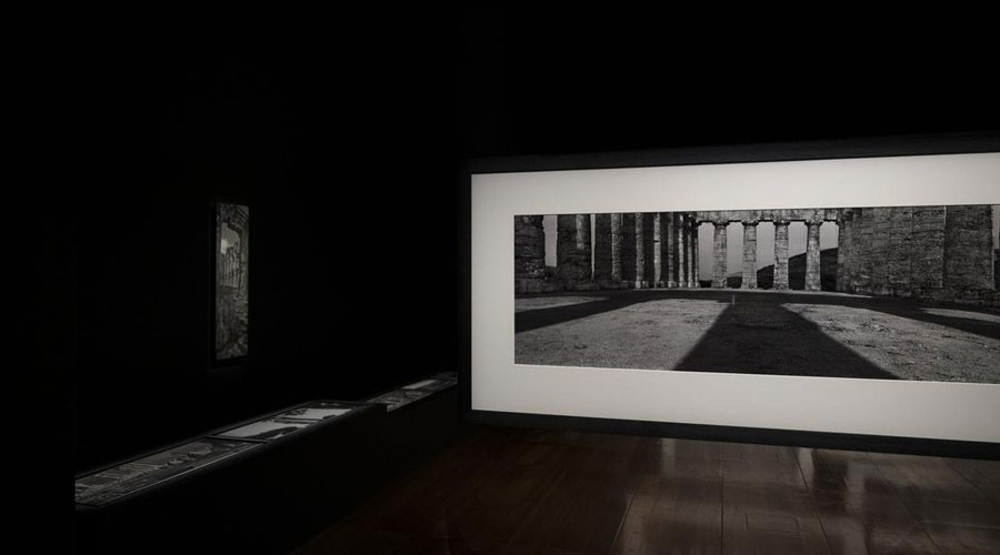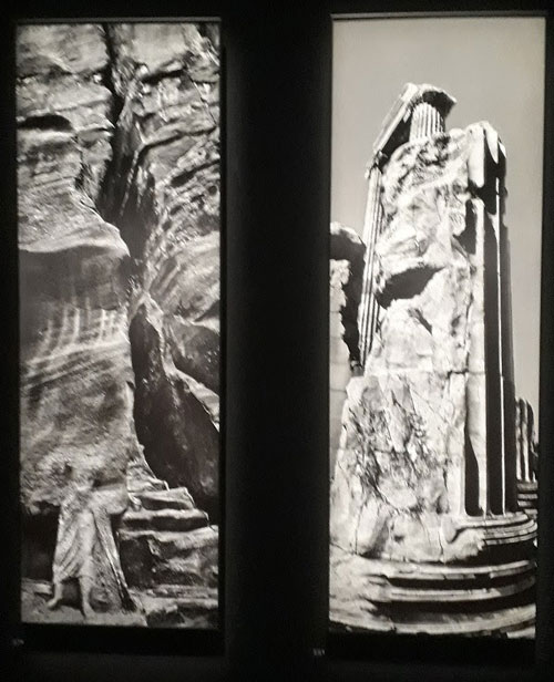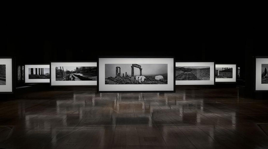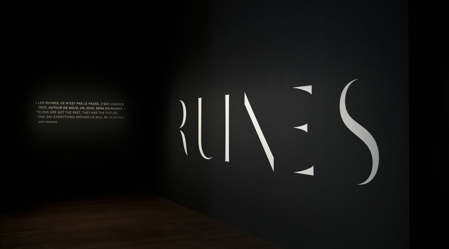 A exposição na Biblioteca Nacional de França (até 16 de dezembro) apresenta uma parte (110) das 170 fotografias que Koudelka doou ao BnF. Mas, implicitamente, a abordagem escolhida aqui é bem diferente da do livro: as fotografias são identificadas apenas por números, às vezes no chão e, antes de os negligenciar preguiçosamente passado um momento, é necessário reportar a uma folha de sala para descobrir a qual cada um se refere (só um olho exercitado e perito pode reconhecer num ápice Delfos ou Palmira). Não há lógica geográfica ou histórica para o esquema de apresentação das imagens, mas apenas agrupamentos formais e estéticos. Às vezes a ruína mal é visível, como no grande Grand Saint Bernard enevoado. A cenografia pretende ser "um andar rítmico mas aleatório, favorecendo as surpresas visuais e a renovação do olhar". O resultado é, portanto, muito diferente da leitura do livro: em vez de descobrirmos AS ruínas, nós vemos aqui UMA ruína única, genérica, polimórfica e ubíqua. Em vez de experiências locais diversas, é a própria ideia de ruína com que somos aqui confrontados. Por isso, é muito interessante ver como, a partir do mesmo corpus, podemos construir para o leitor e para o visitante, duas experiências muito diferentes, bastante complementares, mas induzindo sensações, emoções e reflexões contrastantes. Quarenta imagens de grande formato estão suspensas no centro da sala, indiscutivelmente as mais emblemáticas. Como sabemos, Koudelka privilegia o panorâmico, que ele subtrai da sua função documental histórica, para torná-lo numa ferramenta de perceção mais íntima da paisagem. Muito poucas das suas imagens são abertas, muito poucas deixam o olhar fugir para a distância, em direção ao horizonte (uma das exceções: o Cabo Sounion). Estas imagens suspensas em duas ou três, frente verso, permitem um percurso errante no meio delas, uma deriva inspirada, um olhar plural incluindo as imagens adjacentes daquela que se observa. Uma vintena de fotografias são panoramas verticais, penduradas nas paredes como janelas estreitas, assassinos cortando a visão. Os dois da Jordânia e da Turquia justapõem a brutalidade rochosa de um desfiladeiro estratificado em Petra e a rocha esculpida, domesticada de uma coluna jónica do Templo de Apolo em Didymes: as fronteiras do deserto e a urbanidade da Ásia Menor, Nabateus e Gregos, acidente de terreno e harmonia controlada, domada. Mas o alto relevo erodido do camelo gigante esculpido na parede e o bloco áspero do qual a coluna parece emergir liga estes dois mundos. Erosão aqui, além turismo, por vezes danos de guerra ou destruições ideológicas: a ruína modifica-se ao longo do tempo (e as fotos de Palmira, tiradas por Koudelka em 2006, mostram uma ruína que não é mais assim); pensamos noutras ruínas noutros lugares, as de Beirute após a guerra civil e os bombardeamentos israelitas, que Koudelka fotografou em 1991, o mesmo ano em que ele iniciou este grande projeto, certamente não uma coincidência. Todas estas construções antigas foram obra de homens impondo-se à natureza, escavando, nivelando, destruindo uma paisagem natural para instalar os seus artifícios de pedra, teatros ou templos, já uma forma de violência paisagística. E o tempo e os homens, por sua vez, destruíramo-nos; quase não há edifícios recuperados e reutilizados aqui, como as mesquitas que se tornaram igrejas ou vice-versa, ou as arenas que se tornaram locais de consumo de espetáculos; a igreja romana dos Santos Lucas e Martinho, cuja cúpula aponta por trás do Fórum de César, acima de um apoio Renascentista.