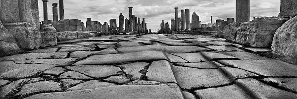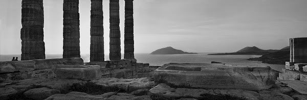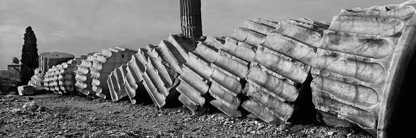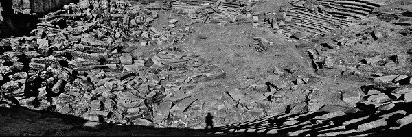 Também na ruína de Koudelka não existem, ou quase, seres humanos, nem mesmo seres vivos (só as ervas selvagens têm o direito a lugar). A sombra de Koudelka no teatro-estádio de Aizanoi numa vista de cima, única aparição de toda a série, é acompanhada por muito poucas representações da figura humana: Neptuno na sua quadriga num mosaico de Ostia, algumas estátuas raras (um togatus acéfalo em Eleusis, Roma personificada em Amazona dominadora em Ostia, o rio Tibre em Tivoli, uma mulher nua no meio de juncos em Dion, e o nosso camelo nabateano), é praticamente tudo (com dois turistas por inadvertência no Cabo Sounion), Koudelka não é um fotógrafo de estátuas. Tudo aqui é inanimado, de pedra, de mármore e de calcário, raramente rochas mais decorativas, como as veias das colunas do Monte do Templo em Jerusalém ou os mármores dos do mercado de Leptis Magna, ou as assemblagens de tijolos mais expressivos (como a parede da Villa de Adriano em Tivoli ou a grelha em primeiro plano do templo redondo de Tibur, também em Tivoli). Algumas vistas do terreno, os traços dos carros no pavimento escurecido da Via Ápia e sobre as lajes de Timgad, ou as pontuações da pavimentação da Rue des Courètes em Éfeso. O que aqui predomina, é claro, é a pedra e as suas vibrações: estrias fervilhantes das colunas, jogos de luz fazendo dançar os degraus no nosso olhar, como no Teatro de Epidauros ou no Estádio das Afrodísias. A coluna partida da Olympia de Atenas é talvez a imagem mais emblemática de toda a exposição, tanto a mais simbólica de uma grandeza caída como a mais bem sucedida esteticamente entre a métrica e jogos de sombra. Catálogo (notável) recebido em serviço de imprensa. Por outro lado, podemos abster-nos de ler "Josef Koudelka, l’épreuve totalitaire" de Jean-Pierre Montier (Delpire, 2004), não que a análise bastante social e política da obra de Koudelka seja desinteressante, mas infelizmente é poluída pelas digressões neo-conservadoras do autor sobre as supostas desonestidades da esquerda francesa, aqui muito incongruentes.