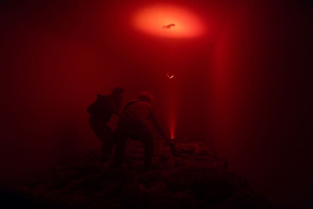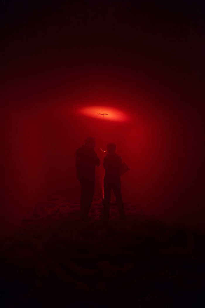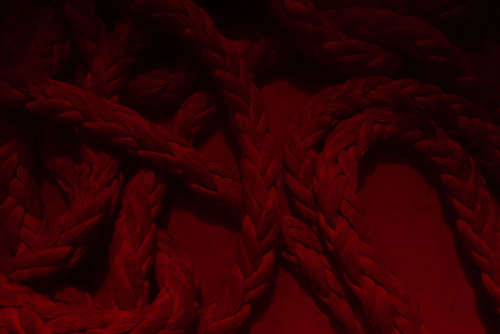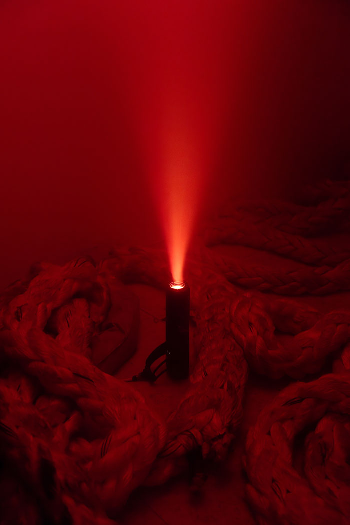 A curta descrição do objecto-poema de que esta exposição parte é-nos dada sem gorduras: “Em 1991, Daniel Faria (1971-1999) ofereceu a um amigo um poema-objecto, redigido sobre um rolo de papel de caixa registadora, com as superfícies laterais mergulhadas em tinta vermelha e envolvido por fio do Norte. À medida que este é desenrolado, surge um texto que, numa caligrafia minuciosa, diz: O País de Deus, Porto 17 de Junho de 1991, ao João Pedro, Na instituição do ministério de Leitor, Sé Catedral do Porto 14 de Julho de 1991.”. O mesmo acontece com a proposição da exposição em si mesma “Rémiges Cansadas é uma exposição que emerge da proximidade de Samuel Silva a este poema-objecto e de um trabalho “para-textual” sobre o mesmo. A convite da Brotéria, o artista foi convocado a declinar da literatura uma experiência plástica.”. Aqui, começam-me as interrogações silenciosas. O que são Rémiges? E porquê, Cansadas? A exposição acontece entre duas salas. Atravessando a pesada cortina, abrindo uma frecha do mais mínimo tamanho, apenas para que o meu corpo consiga atravessar entre tecidos, entra-se numa quase absoluta escuridão. Interrompida nesta entrada, e que já, por mim, lá esperava. Ao fundo uma luz vermelha quebra-a. E é modelada por uma voz, aparecendo e desaparecendo. Palavras calmas que, assim suponho, sejam as mesmas que constituem o poema de Daniel Faria. Ainda na obscurecida primeira sala, há um fumo denso, que também nos esperava, e no qual também penetramos. O chão é ocupado por cordas náuticas, de um sujo que as pressupõe usadas. De uma robustez que nos torna os passos difíceis, já dificultados pela necessidades de encontrar espaço para encaixar o nosso salto. Sente-se a rugosidade e a porosidade. Dos materiais, do espaço. O fumo a tocar na pele, o chão a tocar na corda, a corda a tocar-nos, preenchida de fumo. O título recupera a dupla de palavras de um dos versos do poema O País de Deus. O que nos diz, agora que lhe escapa? Uma exposição, mesmo referindo, mesmo admirando uma figura, um autor, não deverá procurar ilustrar alguma proposição. Isto, caso procure ser pensamento em si, experiência e aprendizagem. O que nos diz Rémiges Cansadas, para além de Daniel Faria, para além do não público poema-objecto do poeta? Poderá Rémiges Cansadas ser uma tradução do poema? Deveria, então, esta exposição ser assinada pelo mesmo autor do poema, Daniel Faria, devidamente assinalado o autor da sua tradução, Samuel Silva? Interrogo-me sobre quais as características desta tradução, não tendo acesso ao original. Uma tradução entre espaços? É uma espacialização de um poema que é um objecto, que já seria passível de ser mostrado num espaço expositivo sem se sentir que ali não pertence. Aliás, escreve quem o leu e a seu propósito, Samuel Silva em 2022, que “A experiência da leitura transforma-se numa experiência física que implica todo o corpo e simultaneamente cinemática, pois a visualização do poema acontece como se de uma sucessão de fotogramas se tratasse. “O País de Deus” enquanto poema não é apenas a escrita que no seu interior encontramos, mas toda a semiologia presente na relação entre seus elementos constituintes: os búzios, o pote de barro, a rolha de cortiça, a cor vermelha, o rolo de papel térmico, o fio norte, o modo de escrita e a operatividade da sua leitura, a distância, o espaço que ocupa, a fragilidade. O tempo.” É exactamente esta leitura do poemas que se transporta para o espaço expositivo, a mesma leitura que traz a este novo leitor, o que visita a exposição, a carga matérica, os seus elementos, a dimensão do tempo e a visualização da escuta e da oscilação. As cordas continuam para uma segunda sala, mais pequena, e ocupam-lhe o chão com o mesmo emaranhado incómodo ao passeio de um olhar desatento. Sugerem-nos que paremos, que encontremos o lugar certo em que o nosso calçado consiga pousar equilibradamente o chão. Há uma tendência para a acumulação de pessoas - não se tenha a sorte de uma visita solitária - no interlúdio entre ambas as salas, onde se escuta e se vê melhor. Mais luz. Mais fumo. Menos Sombra. Menos Vazio. O que se dá, no “declinar da literatura uma experiência plástica”, quando se evocam poemas- objecto, se raptam metáforas, se transduzem palavras escritas para palavras ditas? Todos estes são já lugares híbridos, da experiência plástica da literatura, de um aproximar ao cerne da literatura. No poema Explicação da Escuta, citado e escrito a mel na parede de um espaço expositivo por Samuel Silva, numa anterior ocasião, Daniel Faria diz-nos “Ninguém me chama / Escuto o calcanhar do pássaro/ Sobre a flor / E não respondo.”. Sob o título “A poesia multidimensional de Daniel Faria”, o mesmo texto de 2022 acima referido, Samuel esclarece que o primeiro contacto com a obra de Daniel Faria se deu pela escuta e não pela leitura, no ido ano de 2010. Cansadas parece-me a direcção desta exposição. Este é um lugar de recobro. A cortina isola-nos num lugar esterilizado de outras acelerações do pensamento fruto de contínuos e rápidos estímulos, de tantas conversas sem escuta, de tantos dias sem um profundo silêncio. Entrar nesta exposição assemelha-se, sim, à entrada na leitura de Daniel Faria, onde uma paz nos visita fruto das suas palavras, expressões da sua visão apaixonada e ardente e ainda assim clara e esclarecida do mundo. Não há cegueira. Há contemplação tal como é, sem outros idealismos, tal como se está e como se escolhe. Esta exposição, infira ou não a instituição que a acolhe e a figura maior da poesia que se evoca, concede-nos a possibilidade de escuta, não apenas do texto dito, como de uma qualquer oração interna, visceral, mas coordenada. Menos Incómodo controlado. Precisaríamos que a cóclea se dissesse? Como rumor lançado aos ventos, foi descrita a performanc