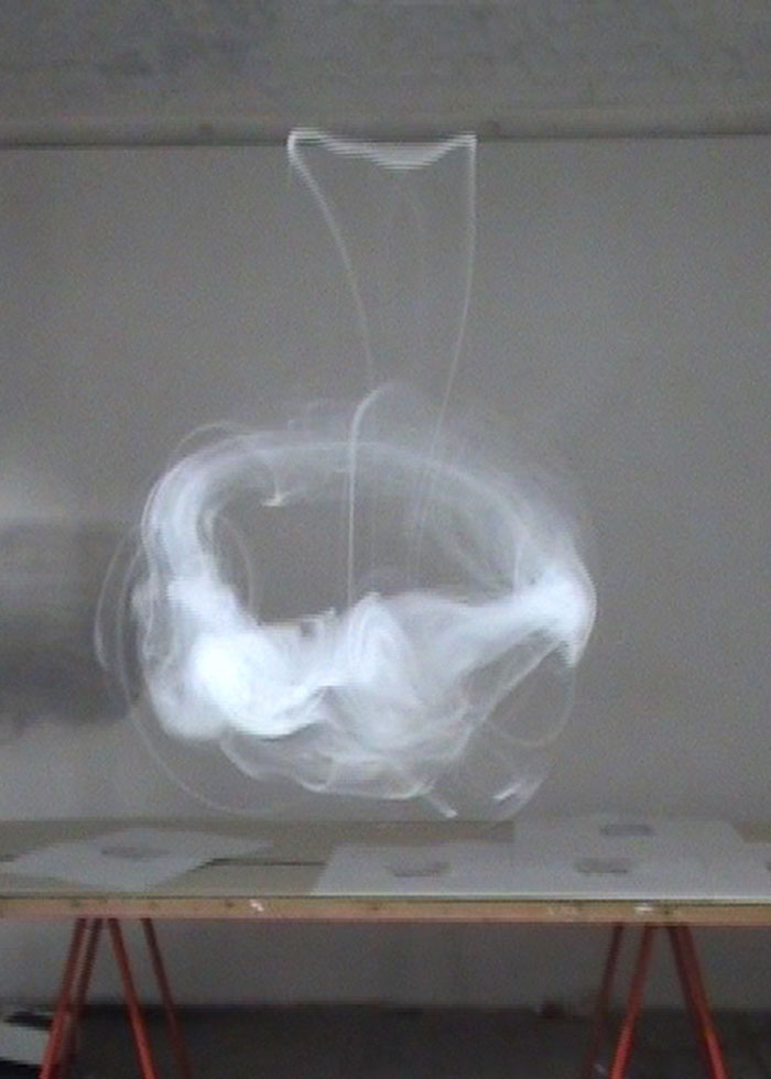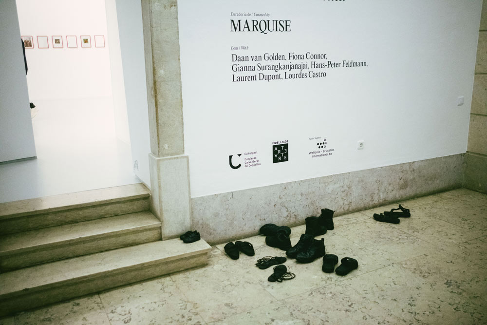 De Daan van Golden, encontramos nesta primeira sala um livro de fotografia desencadernado e mostrado como série fotográfica, numa espécie de reapropriação do seu próprio trabalho. Na última sala, voltamos a ver uma obra sua, Insel Hombroich (1988/2012), cinco fotografias da filha do artista a fazer a roda em frente de uma pintura de Yves Klein. Nestas obras, debatem-se algumas das questões que percorrem a obra do artista, como o fazer artístico presente em todas as suas acções pessoais, a repetição e o emergir do novo ao voltar a olhar. De Lourdes Castro, podemos ver uma obra menos conhecida, feita com pratas de chocolates e tinta sobre acrílico, Automóvel (1965). Tem alguma ressonância com as caixas de cartão de Laurent Dupont, porque tal como elas se podem espalmar e voltar a montar, esta imagem de um automóvel visto de cima também tem qualquer coisa de estrutura de cartão que se pode montar, passar da bidimensionalidade do quadro à tridimensionalidade do uso quotidiano. Na última sala encontramos cinco cilindros com cola líquida no interior dispostos no chão, uma obra de Gianna Surangkanjanajai. A cola torna visível o cilindro de acrílico e cria uma relação curiosa entre peso do objecto e leveza visual. Já na saída para a última sala, encontramos Autorrádios fotografados enquanto tocava boa música (1970s-1990s), de Hans-Peter Feldman. Seis fotografias a preto e branco e a cores, que parecem “objet trouvé”, que pelo curioso título despertam uma interrogação sobre a relação entre o sonoro e o visual, a “qualidade” artística ou musical, o “gosto”, etc. A terminar a exposição, a projecção de Atelier 2007-2008, le film (2009), de Laurent Dupont. O artista filma as argolas de fumo que vai fazendo ao fumar no seu atelier. Filmado durante um ano, combinando diferentes excertos, "o vídeo pode ser visto durante um minuto ou uma hora". Vemos as formas circulares a rodopiarem no ar e vemos também, voyeristicamente, os detalhes do seu atelier. Possivelmente porque estamos já influenciados por uma imagética da criação digital, esta simples actividade “analógica” que todos reconhecemos ganha de repente uma nova perspectiva, especialmente nos momentos em que as argolas flutuam pelo ar como criações artificiais, já sem um referente à sua origem, apenas como formas geométricas que se sobre-impõem ao espaço. Este contraste e conexão entre formas perpassa toda a exposição. Mas, segundo Pedro Ramos, “as relações entre as peças não são finais”. Ao convocar estes artistas e estas obras, MARQUISE propõe uma entrada num território que não se quer circunscrito, nem de perspectiva única. Podemos habitá-lo sem sapatos, percorrendo silenciosamente o espaço, mas podemos também procurar as marcas que outros deixaram, que se agarram aos objectos, às paredes, ao desenho do lugar, e assim vermos todos territórios distintos.