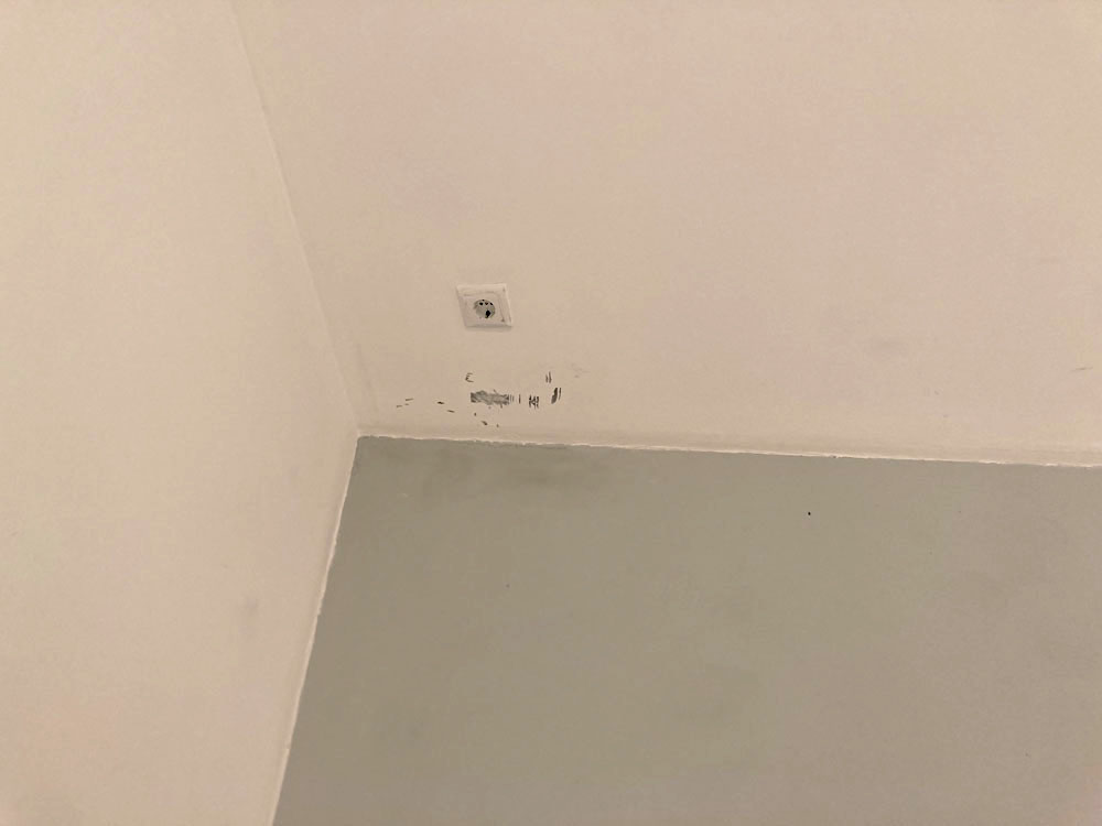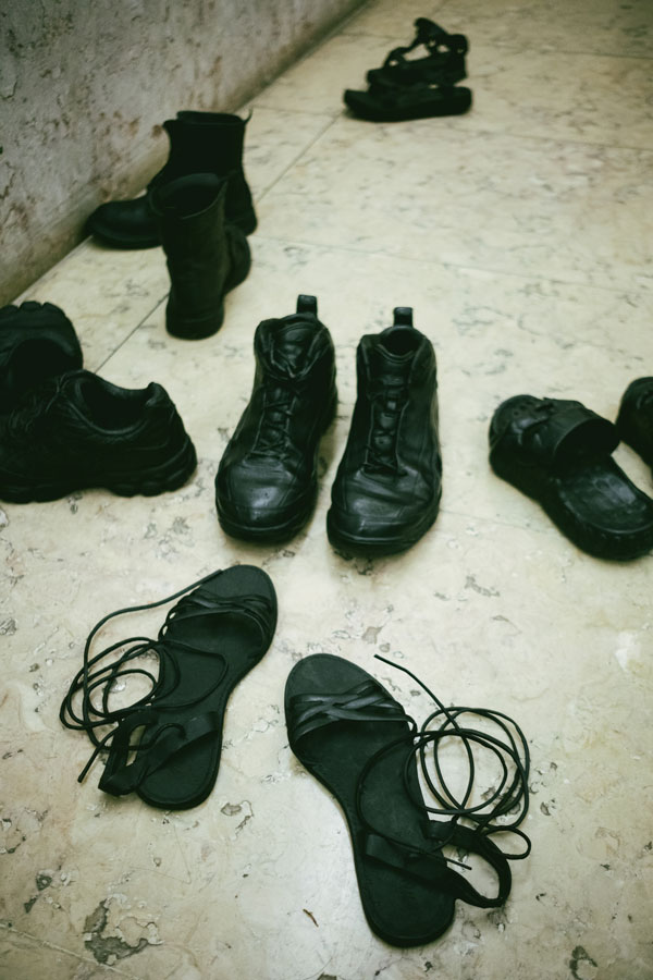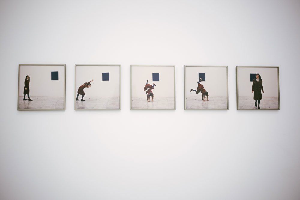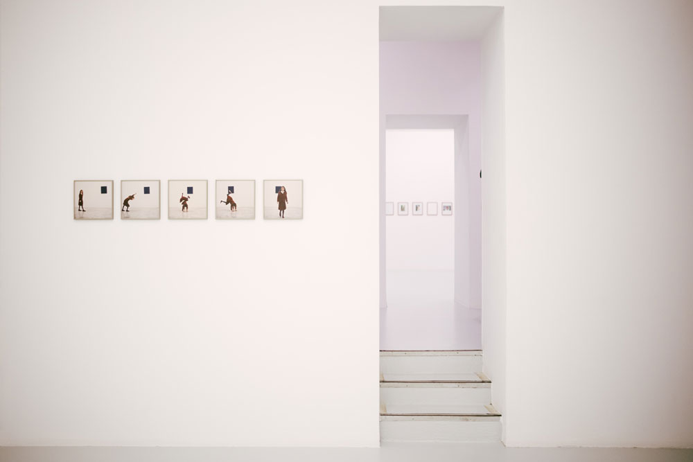 Logo à entrada das salas de exposição, vemos um conjunto de sapatos pousados à porta que poderiam ser confundidos com os dos visitantes, não fossem eles feitos de bronze. A dúvida sobre tirar ou não os sapatos antes de entrar no espaço pode passar pela cabeça do visitante, assim como a dúvida sobre o que se “passará” lá dentro para termos que tirar os sapatos. Para Pedro Ramos, esta instalação de Fiona Connor cria uma ambiguidade na classificação do espaço expositivo, que pode ser visto como um espaço semelhante ao doméstico, onde se “passa” algo distinto do que ocorre no espaço público. Também pode chamar a atenção para as outras coisas que acontecem num espaço expositivo para lá da centralidade das obras. Para Fiona, pode remeter também para a ideia do espaço expositivo como um espaço asséptico, limpo. É curioso que logo ali na entrada esteja também a primeira “marca” na parede, a sujar esse “white cube”. Haverá mais duas ao longo da exposição. Tratam-se de Scuff #3, #6 e #7, obras em grafite que são stencils de marcas feitas pelo roçar de coisas em paredes, recolhidas pela mesma artista em edifícios (neste caso numa escola) e que, segundo ela, reproduzem “a marca perfeita do contacto do corpo com a arquitectura”. Uma das marcas está colocada debaixo de uma tomada, porque era assim que estava no local original.