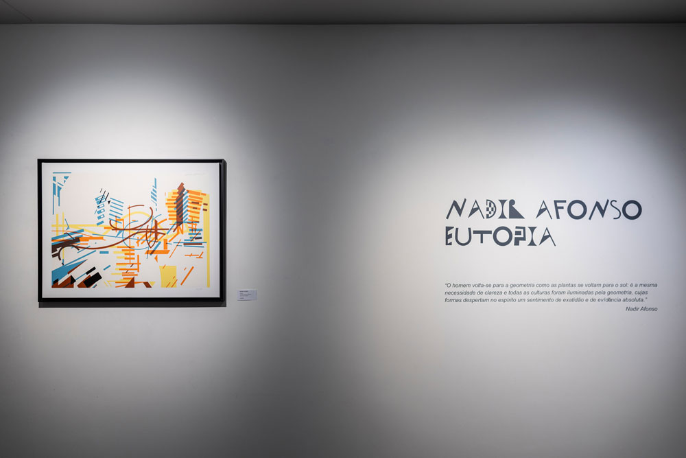 Atentemos no título da exposição Eutopia. Eutopia é um espaço exterior que materializa os valores locais, suscitando-os como aspiração e medida de construção, mas pensemos a expressão de uma outra forma, pensemo-la através da prefixação eu que se insere na palavra utopia: Eu-topia. Desta forma, pressentimos uma intervenção de aglutinação ou coalescência entre duas posições, embora não necessariamente antitéticas, pelo menos contrastantes. Se de facto, Nadir Afonso escolhe o caminho utópico como a impassibilidade imutável das formas e posições estáveis da incidência sempiterna regedora do universo, as leis geométricas, existe uma constatação da contínua deviniência da estrutura não só puramente ontológica do homem enquanto condição essencial de ser, mas também enquanto ser percipiente e senciente que sente, intui, pressente, conhece e adequa o seu conhecimento numa instrumentalização racionalizante, mas afectada pela carga temporal da voragem transitiva da mudança. Tudo, na vida do homem, parece ser regido pela manipulação da intervenção do acaso ou da problematização contextual de uma certa compreensão limitada de um dado sujeito. Esta impressão ínsita num estrato arqueológico mais denso ou profundo, cuja visão clarificada se anula quando vista à superficialidade desinteressada, contudo, promete-nos uma recuperação da acalmia na turbulência dos redemoinhos e das vagas entrópicas das mutações, levando o artista a efectuar uma operação intransitiva que modula e modela os elementos naturais pela sua imperturbabilidade regedora da codificação construtiva. O homem volta-se para a geometria como as plantas se voltam para o sol [1], pois a geometria é o passo utópico para a estabilização e consolidação da permanência das leis que se manifestam na natureza eutópica. Nadir Afonso, teorizador dos mecanismos sencientes e perceptivos das formas, elaborou não só através dos seus textos, mas também por intermédio do seu corpus de obra uma redefinição estética assente na exclusão das posições antinómicas entre perspectivas e posições materialistas ou idealistas, a favor de uma concretização consistente, depurada e enredada no desvelamento sensorial das leis que subjazem o universo. Deste modo, a sua concepção artística inverte os postulados cognoscitivos (assentes na geometria como fonte puramente matemática e racional) para relevar como metodologia positiva de trabalho hilemórfico artístico, os valores operativos da elaboração e construção formal retirados da natureza experienciada pelo homem, por intermédio da intuição, do pressentimento das formas elementares (geometria natural, a de Tales de Mileto). Através desta cerrada posição quantitativa, as assimetrias e oscilações metodológicas deixadas pela diferenciação histórica entre a perspectiva naturalis (percepção esférica produzida pelo sistema retiniano) e a perspectiva artificialis (artifício matemático-racional criado pelo artista numa solução plana) são neutralizadas, se não mesmo destituídas para despoletar por inerência estética uma impressão de complexificação de espaços e superfícies cromáticas e lineares descentradas de uma referência unívoca, eliminando a ideia de dispositivo totalmente racional. A obra Gronelândia elimina qualquer intervalo de profundidade explicitado pela figuração em escorço, pois em contraste, intensifica os valores cromáticos aliados às identificações fragmentárias de vários elementos geométricos (pressentidos, mais do que explicitamente expressos), rebatidos no espaço topológico, cuja disrupção de centros ou eixos de representação, levam a uma disposição estética categorizada por figurações distintas, mas rigorosamente estruturadas (caso único, pois as restantes obras em exposição representam fases mais tardias da estética nadiriana em que podemos verificar certas intuições perspécticas integradas em representações arquitectonicamente referenciáveis) .