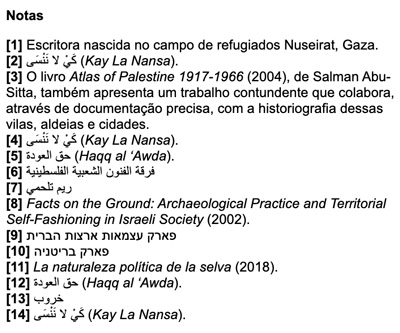 A escritora Adania Shibli dedicou o ensaio A Lesson in the Nature of Resistance (2025) ao pequeno arbusto de alcaparras do jardim dos seus pais, onde passou a infância. O texto breve termina com a imagem de um galho deste teimoso vegetal brotando das frestas da parede do depósito que foi construído no lugar onde existia, mais de trinta anos antes. A insistência vital da planta nos lembra que os seres não-humanos atuam ininterruptamente sobre os espaços e os sujeitos. Entretanto, é comum nos esquecermos deste fato evidente. Assim como o mundo geo-biológico é sempre histórico, a história tem caráter físico – é, também, topografia, paisagem e bio ou cosmogênese: agência em forma material. A exposição All That Remains [2], de Inas Halabi (Palestina, 1988), patente na galeria La Loge, em Bruxelas, é construída precisamente a partir dessa premissa. O título faz referência ao livro homônimo de Walid Khalidi, que leva, ainda, o subtítulo The Palestinian Villages Occupied and Depopulated by Israel in 1948. No início da obra, o autor declara o contexto do seu estudo: o texto convoca a memória da destruição e do apagamento físico dos vilarejos palestinos obliterados em 1948 durante o Nakba – a “catástrofe”, o êxodo forçado de cerca de 750 mil palestinos como consequência do projeto colonialista-sionista de instauração do Estado de Israel – revelando como a paisagem atual ainda guarda vestígios silenciosos desse mundo desaparecido. Khalidi evoca, ainda, a presença de oliveiras e outras árvores frutíferas, cactos e plantas que sobreviveram ou cresceram descontroladamente nessas regiões, declarando que o livro – um esforço impressionante de catalogação com informações historiográficas detalhadas relativas a centenas de cidades – deve ser compreendido como uma espécie de “memorial” a estes locais e pessoas [3]. Em All That Remains [4], Halabi atualiza esta proposta, lembrando que o Nakba é um processo contínuo e salientando, sobretudo, um aspecto perverso da ocupação israelense: a criação, ao longo de décadas, de parques florestais sob administração da instituição sionista criada em 1901 Jewish National Fund (JNF), em territórios onde antes haviam populações e cidades palestinas. As quatro obras apresentadas na exibição foram produzidas enquanto fragmentos do filme em produção The Right of Return [5]. Logo no primeiro piso, perto da entrada da galeria, uma sala à direita nos leva ao Fragmento I. O espaço onde a instalação se encontra é completamente fechado, sem nenhuma entrada de luz. Escutamos sons e vozes enquanto os olhos demoram alguns instantes para perceber as palavras escritas em três paredes. Nos segundos de desorientação visual, adentramos abruptamente no mundo criado por Halabi: uma Palestina inscrita entre o passado anterior ao Nakba, a continuidade deste processo de limpeza étnica no presente, e um futuro em aberto que a artista convida a imaginar. Os textos projetados por três carrosséis de slides são nomes de cidades e aldeias destruídas em 1948 e 1967 por grupos paramilitares sionistas e, posteriormente, pelas Forças de Defesa de Israel (IDF). Além de expulsar, assassinar e violentar seus habitantes, os vestígios físicos das construções foram quase integralmente apagados, demolidos. Os nomes das cidades também foram trocados por outros em hebraico, que não referem os originais. Ao mostrar os nomes originais na ausência de qualquer imagem, a instalação expõe a violência sionista duplamente: na aparente falta de visualidade consequente da destruição, e na própria linguagem – um campo sempre necessário à disputa política; conforme Edward Said afirmou em The question of Palestine (1979), “a simples menção a Palestinos ou à Palestina é nomear o inominável”. Confrontando esta interdição, a primeira obra da mostra explicita seu intuito: a reivindicação do fazer histórico através de imagens e sons, sublinhando que todo fazer da história é, também, um fazer político. Acompanhando a sequência de nomes, ouvimos uma miríade de sons, dos quais vários foram captados no local das vinte e quatro aldeias assoladas que compõem a instalação: o canto de pássaros, jatos militares de combate, vozes e canções tradicionais palestinas gravadas pelo grupo El-Funoun Palestinian Popular Dance Troupe [6] e pela cantora Reem Talhami [7]. Saímos desta sala inebriados pela quase completa escuridão e pela intensidade tanto sensível quanto semântica do áudio. Após a imaginação flutuar entre temporalidades distintas em um movimento de projeção mental daquilo que não é mostrado visualmente, aparecem as primeiras imagens da exposição: ao subir as escadas ao fundo do corredor, nos deparamos com o Fragmento II – fotografias projetadas por outro carrossel de diapositivos. As imagens, aqui, mostram plantas, árvores, bosques: ambientes verdes, de “natureza”. Conforme as fotografias passam, percebemos, em algumas delas, ruínas de pedra e partes de construções. São os destroços das antigas cidades da Palestina, resquícios que precedem a instauração violenta do Estado de Israel em 1948. Segundo a antropóloga Nadia Abu El Haj, a maior expressão do mito sionista de “redimir a terra” – fundamental para o estabelecimento do novo país – é a ocupação do território sob o conceito de Yishuv (cuja tradução literal do hebraico é “assentamento”). Abu El Haj também afirma que o projeto de “fabricação de lugares” é, na prática, uma reconfiguração material e simbólica da paisagem [8]. Sob o pretexto de fazer florescer uma “terra vazia” e árida, o JNF administra mais de cento e cinquenta parques e florestas com nomes tão sórdidos quanto “American Independence Park” [9] ou “Britannia Park” [10], onde estão ausentes quaisquer informações históricas a respeito da sua ocupação compulsória. Halabi expõe de forma poética 