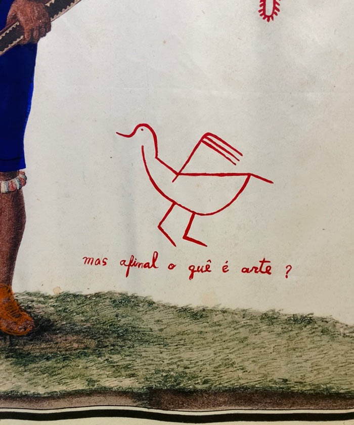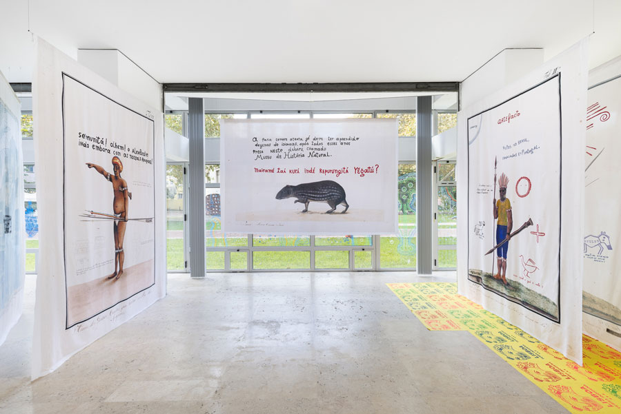 Nascido em Barcelos, no Amazonas, Denilson Baniwa desenvolve uma prática que atravessa múltiplas linguagens, como pintura, desenho, performance, intervenção digital e apropriações críticas de acervos iconográficos. Cada gesto que compõe sua produção configura-se como uma insurgência poética, capaz de tensionar as estruturas que ainda organizam a memória ‘oficial’, abrindo brechas por onde outras histórias, cosmovisões e narrativas podem emergir. Fica evidente, ao percorrer a galeria, o potencial da arte como espaço de cura e de confronto, articulando de forma indissociável dimensões éticas, espirituais e políticas. O conceito de contra-feitiço se conecta ao feitiço colonial, que transforma elementos das culturas indígenas em fetiches ou mercadorias, funcionando como instrumento de controle simbólico e cultural. Diante das obras, observa-se como o gesto de Baniwa subverte a lógica colonial, questionando quem detém o poder sobre a memória e a narrativa, ressignificando imagens para restaurar protagonismo. Ao reorganizar acervos coloniais, Baniwa pratica esse contra-feitiço, revertendo o feitiço colonial que transformou territórios, seres humanos e não-humanos em objetos de consumo e espetáculo, reafirmando a identidade indígena. Essa desprogramação atravessa o espectador, provocando uma experiência de tensão, reflexão e consciência sobre a resistência indígena, evidenciando um gesto insurgente que desfaz a dominação colonial e afirma a criação contínua das culturas indígenas. Logo na entrada, o chão deixa de ser suporte neutro, cartazes coloridos e vibrantes se oferecem aos pés do visitante, convocando o corpo a atravessar a obra e a se confrontar com ela desde os primeiros passos. Neles, lê-se a frase “Lisboa é terra indígena”, que afirma que o pensamento e a continuidade indígena não se limitam à geografia da floresta, funcionando como performance permanente. Ao percorrer a exposição, torna-se notória a forma como a presença ancestral e o território se articulam no espaço, ao mesmo tempo que esses cartazes evocam a memória de objetos sagrados aprisionados em museus e arquivos históricos e etnográficos de Lisboa e Coimbra, como, por exemplo, o manto ritualístico. A atuação deste trabalho provoca a reflexão sobre a persistência do colonialismo nas instituições ocidentais, suscitando a consciência da continuidade e existência indígena. No percurso da exposição, a série Rasuras (2025) merece atenção especial. Nela, Baniwa intervém sobre impressões digitais em tecido do acervo do naturalista Alexandre Rodrigues Ferreira, disponibilizadas pelo Museu Nacional de História Natural e da Ciência da Universidade de Lisboa. As obras tornam visível a dívida histórica do etnocídio contra os povos indígenas e revelam como os acervos iconográficos reforçaram a mercantilização de objetos sagrados, das vidas indígenas e da fauna e flora local. Nesse gesto, a obra estabelece um diálogo com o pensamento do ativista e escritor Ailton Krenak, autor de Ideias para Adiar o Fim do Mundo (2019), que alerta para a necessidade de desestabilizar as lógicas de dominação antropocêntrica que estruturam nossa relação com o mundo. Como ressalta Krenak, “talvez estejamos muito condicionados a uma ideia de ser humano e a um tipo de existência; se desestabilizarmos esse padrão, nossa mente poderá sofrer uma ruptura, como se caíssemos em um abismo. Mas quem disse que não podemos cair? Quem disse que já não caímos?” (Krenak, 2019). A obra de Baniwa ecoa com o pensamento de Krenak, evidenciando a necessidade de repensar as estruturas que condicionam nossa relação com o meio em que vivemos e com as formas de existência. O artista amplia sua crítica ao intervir em imagens do acervo colonial, inserindo nos corpos representados elementos da cultura visual contemporânea, como marcas globais, objetos tecnológicos e signos da vida urbana para deslocar a percepção do espectador e provocar um choque visual, rompendo estereótipos que associam os povos indígenas a um passado fixo, alheio à modernidade. Ao evidenciar que o uso de roupas de marca ou de aparelhos tecnológicos não implica a perda da identidade indígena, Denilson afirma a contemporaneidade desses povos, reposicionando a tecnologia como instrumento de comunicação, resistência e afirmação política. É possível notar também que Baniwa articula imagem e palavra em obras de grande escala, incorporando inscrições textuais que funcionam como camadas de leitura crítica. Pintadas à mão, de forma sutil, sobre o tecido impresso, essas frases exigem aproximação física, instaurando um gesto de atenção e escuta que se contrapõe ao distanciamento do olhar museológico dominante. Entre estas frases, destaca-se “Pensamentos decoloniais em conflito com a conta de energia elétrica atrasada”, que emerge da cabeça de um homem indígena, expondo o choque entre a produção de pensamento crítico e as urgências concretas da vida cotidiana, revelando sujeitos indígenas atravessados por responsabilidades econômicas e desigualdades estruturais. Outras frases, como “todo acervo fechado é uma coleção de mortos, sem ânimo, sem paixão”, denunciam o carácter fetichista das coleções coloniais, em que corpos, objetos e até espíritos de animais permanecem aprisionados. Já a pergunta “Mas afinal, o que é arte?” desloca o debate para o campo artístico, convidando o público a refletir sobre os critérios institucionais que definem o que é considerado arte e quem detém o poder de legitimá-la. Ao condicionar a compreensão da crítica a um gesto ativo de aproximação e atenção, Baniwa transforma sua prática em ato político, revelando que palavra e imagem juntas têm o poder de questionar as narrativas e os sistemas de poder que determinam o que pode ser visto, preservado e reconhecido como arte. No contexto português, marcad