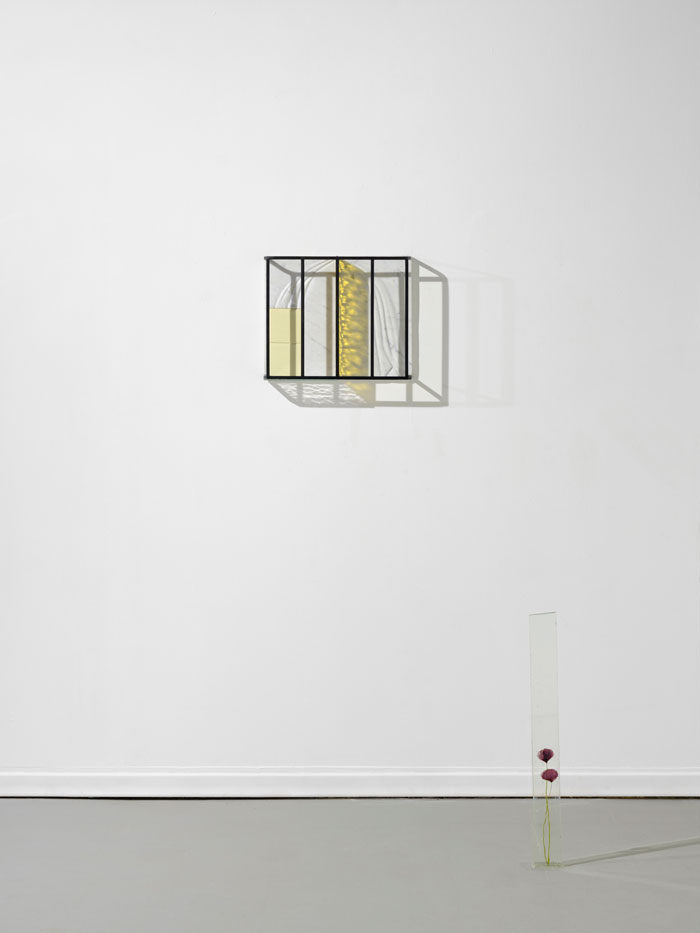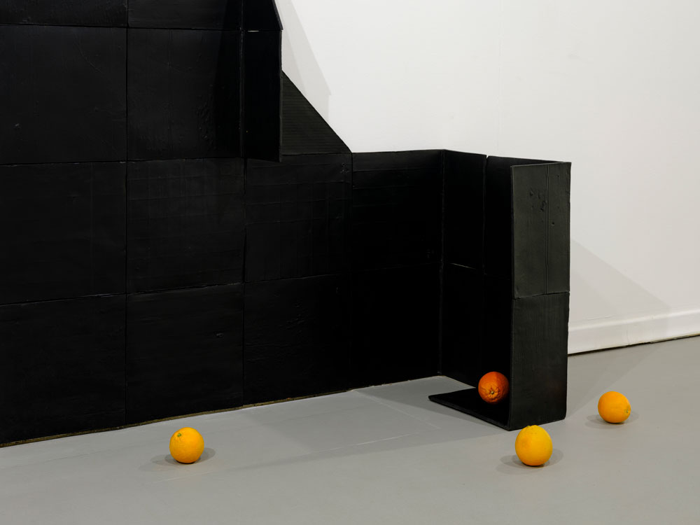 No começo do percurso, Almendra colocou uma estrutura ténue, delgada, sobre o solo, ao centro da sala. Vários materiais, alguns de frágil construção, como chapas onduladas entre outros, assomam, articulados entre si, de modo débil. A estrutura, que aparenta ser uma amostra de um pequeno habitat, um abrigo, ou vedação, foi construída com o recurso a vários materiais reciclados, que terão sido encontrados ao acaso, no campo ou na cidade. Intuímos essas pequenas construções, como os espaços imaginados em que se inserem. Almendra consegue, primeiro, transportar-me para fora da galeria, e depois, fazer-me perceber, através da transitoriedade, a inexistência de barreiras arquitectónicas.