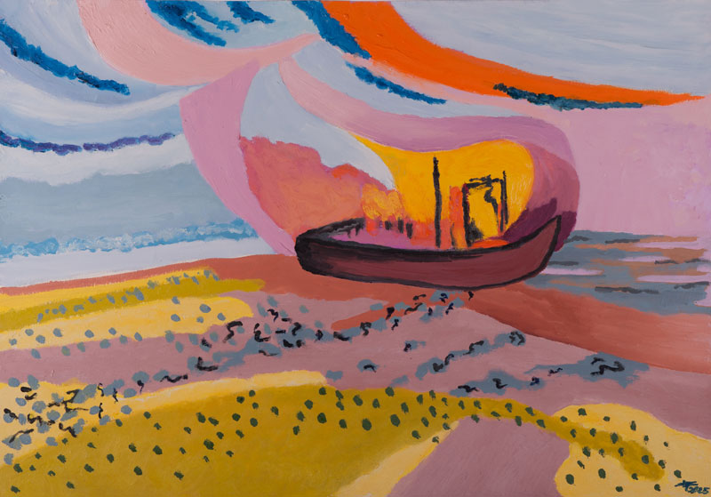 Há ainda a salientar, por outro lado, que o texto* de Joseph Conrad, retirado do livro Coração das Trevas, serve de referência literária ou conceptual à exposição do pintor. O texto parece oferecer um contexto interpretativo ou uma atmosfera que dialoga com várias destas obras, sugerindo temas relacionados com a introspecção, a complexidade emocional ou reflexões acerca da condição humana. A citação de Conrad destaca a ideia de vozes, memórias e experiências vividas com intensidade, o que pode estar associado à inspiração por trás da pintura de Conefrey, criando uma singular afinidade electiva entre literatura e pintura. Este novo projecto exposto na Galeria 111 parte da referência literária de Conrad para, de alguma maneira, encontrar novas formas de representar aquele sentimento de deslumbramento misturado com “absurdo” perante forças que superam o humano. As pinturas de Conefrey lançam-nos num mundo onde a ficção visual e literária se cruzam de maneira algo paradoxal, levando-nos a pensar que afinal nós nascemos no meio de uma história já em andamento e morremos antes de ver o fim da história do mundo. Ou seja, vivemos sempre entre um começo e um fim que não controlamos. Isso cria uma dificuldade: o tempo vivido parece caótico, sem forma clara onde apenas sentimos a vibração pujante da vida através das cores existentes da natureza e do movimento impressionista que delas dimanam. Estas pinturas encaminham-nos para um impressionismo cromático difuso que se manifesta de um modo descontínuo ou fragmentário, através de pequenas pinceladas que transmitem sensações originadas a partir de acontecimentos soltos no tempo, remetendo o espectador para um tempo vivido como se de repente deixasse de haver um fim ou um sentido para o que contemplámos e interiorizamos através da experiência literária em diálogo com as imagens da arte. As pinturas de Conefrey convidam-nos a viajar até ao coração de uma narrativa psicológica escrita por Conrad centrada na história contada por Marlow, um capitão de navio cuja missão é transportar marfim e resgatar um agente chamado Kurtz que cometeu atrocidades e que passou a ser adorado como um deus. Kurtz vive isolado num lugar remoto de quem não se recebem notícias há muito tempo. Encontra-se gravemente doente e morre no navio durante o regresso sendo as suas últimas palavras: “Que Horror! Que Horror”. É curiosa a influência cultural que esta extraordinária obra-prima do século XIX escrita por Joseph Conrad exerceu no Ocidente, tendo sido ela a principal fonte de inspiração do filme de Copolla, Apocalypse Now (1979), que transpõe a história para a Guerra do Vietname, sendo a loucura de Kurtz interpretada por Marlon Brando.