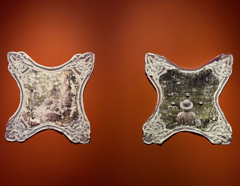 A reflexão estende-se para as imagens desta performance transferidas sobre tecidos rendados da avó da artista, contrapondo o casque colonial usado pelos colonos também para evitar enfermidades e as bruxarias de que tinham receio. As obras de arte rodeiam-se de nzimbo.