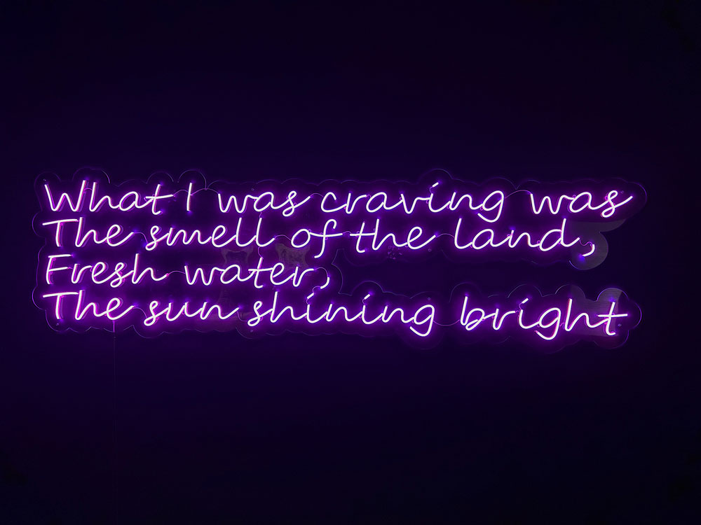 No ambiente criado pelas cores das paredes e chão, as luzes fundem-se com o letreiro roxo, com a frase: