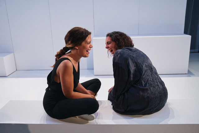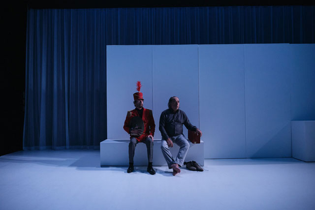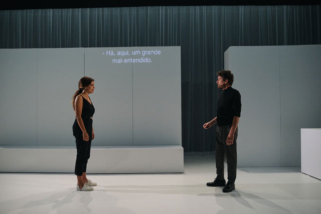 GG: Chegámos a um ponto em que duas pessoas podem viver a milhares de quilómetros de distância e ainda assim escrever uma peça juntos. O Cédric estava em Paris e eu estava em Lisboa ou Viseu — divido-me entre as duas cidades. Fomos trocando correspondência por e-mail, trocando ideias. Liamos as coisas um do outro e respondíamos de seguida, este foi o modos operandi — que na verdade, para mim, não é suficiente para escrever uma peça. As residências artísticas foram fundamentais para o processo da escrita. Deram-se em Viseu — onde tenho o projecto Creta — em Lisboa, em Montemor-o-Novo no Espaço do Tempo, e em Paris. Foram residências de escrita, de abordagem ao texto. O encontro foi e é fundamental para a criação — costumo dizer que não é por acaso que um grupo de teatro se chama companhia! O teatro faz-se em companhia, na companhia uns dos outros. O processo foi muito intuitivo, não foi estudado à partida. Fomos descobrindo à medida que escrevíamos. Houve uma coisa que achei muito curiosa: eu escrevo em português e o Cédric escreve em francês. Às vezes conversamos em inglês, para nos entendermos, o meu francês não é bom e o português do Cédric é inexistente (risos). Os textos têm que ser lidos na língua que vão ser falados, e por isso tivemos mais do que uma tradutora connosco a fazer o trabalho de tradução. Durante esse trabalho, fui percebendo muita coisa sobre escrita! De repente, lês qualquer coisa tua traduzida e dizes: isto não foi o que eu escrevi! E não é que a tradução seja má, o facto é que a tua ideia não era muito clara à partida. Começas a perceber pequenas subtilezas na própria escrita, que neste caso, é a tradução de uma língua para uma outra. O teatro é um exercício de tradução, traduz-se da página para o espaço. Estes problemas de tradução deram-me uma outra perspectiva sobre a escrita e a dramaturgia.