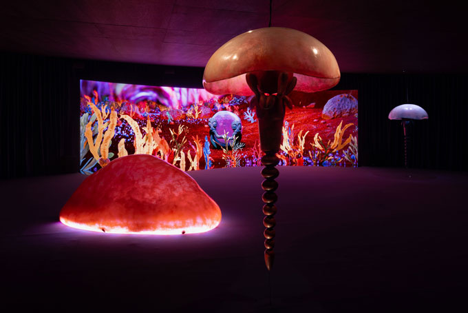 No espaço fora do ecrã, duas grandes esculturas bioluminescentes lembram-me caravelas portuguesas. Uma das faixas de sons que se ouvem provém da escultura, de dentro da copa na qual nos podemos abrigar, como se entrássemos também na animação, na oscilação dos corpos híbridos. Diz-nos das suas posições quanto ao universo, sobre os problemas do mar, tenta-nos à fusão com a sua própria identidade. Alicia-nos com o que se irá tornar um dia, o dia que alimentará outros seres. Mistura-nos as construções temporais e providencia-nos de imagens de tudo o que vê. Depois, parte pelo espaço para se tornar uma outra coisa; transformam-se as relações do espaço; das narrativas; dos sons; das sugestões criadas por todos os estímulos.
