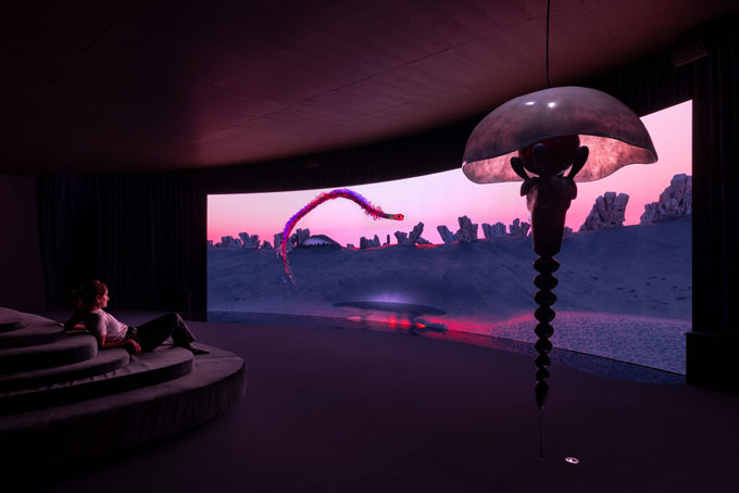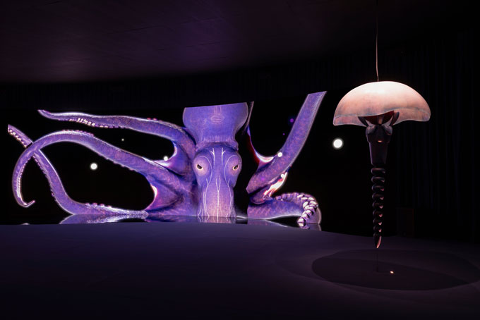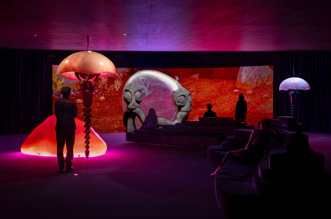 Numa grande tela, uma longa animação dá-nos a ver espécies encantadas e encantadoras. O negro, a luminescência; cores e tentáculos vão dançando. Tudo oscila, desliza. Dois grandes sofás que antes do toque se aparentam a sólidas rochas estratificadas, permitem que o corpo relaxe e descanse, e desfrute da faixa sonora para ir deslizando para esta realidade paralela, de onde são soprados feitiços. De quando em vez uma voz, muito baixa e incompreensível, acentua a sensação de que estamos a ser enfeitiçados ou de que, não sendo sobre nós aplicada, uma força maior e mais antiga se manifesta por ali.