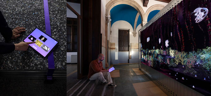 well of spæc(i)es divide-se entre dois edifícios distintos. Por um lado, a Academia de Belas Artes de Veneza, por outro, o Instituto de Ciência Marinha. No primeiro, visitamos a obra propriamente dita, uma instalação que nos suga directamente para uma dimensão paralela. O segundo funciona como espaço satélite dessa instalação, onde temos acesso não apenas a uma quota parte da investigação realizada para swell of spæc(i)es – para a qual contribuiu o diálogo e cruzamento com cientistas deste mesmo instituto – como podemos ainda, fazendo uso de uma personalizada ferramenta de inteligência artificial alimentada apenas por referentes do projecto de Josèfa – de imagens de plâncton captadas pelo Instituto de Ciência Marinha a representações escultóricas detidas em colecções ocidentais de entidades divinas e espíritos aquáticos tais como Nommo e Mami Wata, presentes nas culturas africanas e caribenhas – personalizar as nossas figuras híbridas, mitológicas, sinuosas, aquáticas ou banhistas conforme as acoplações.