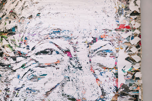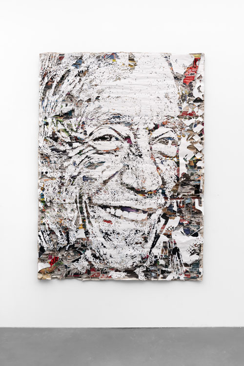 Alexandre Farto aka Vhils, 2025. Jornais esculpidos à mão. Inspirado numa fotografia de Rui Ochoa. Alt. 195 x Larg. 120 cm. Museu da Presidência da República. © Alexander Silva