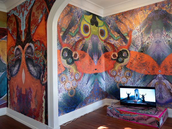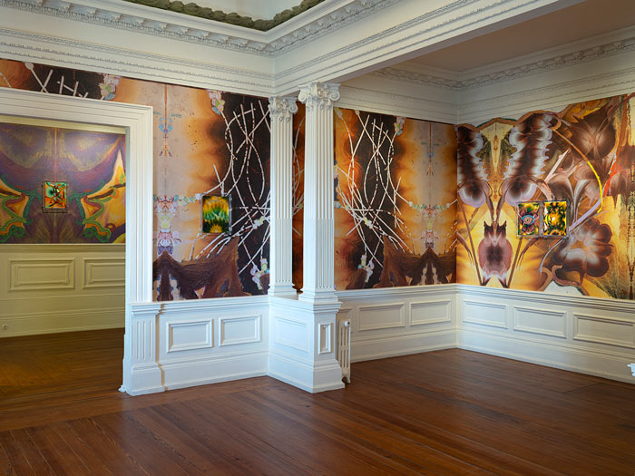 When Kerstin decided to put wallpapers all over the place, I suggested keeping one space without it, like a classical exhibition space, because I think you learn from contrast, you learn from being able to compare two things. You can see the difference it makes to the architecture. How does this house look when you put wallpaper, and how does it look like when there is no wallpaper and white walls? Secondly, I also suggested: let's put your paintings just in front of a white wall so that we can really see them. The contrast was significant. It's not one or the other, it's always both, a dialogue, an extension.