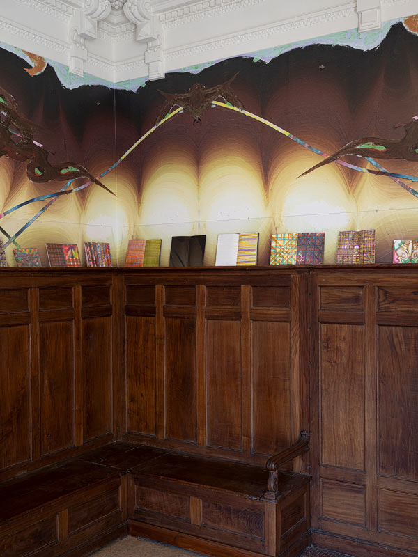 It was again her idea. Going downstairs, she saw these wooden panels with a cornice and decided to put the booklets there. She started them before becoming an artist (…) she was just making drawings in a book, like a diary, and continued doing them. Those are the most private things she does. Although it's just abstract, it's not writing.