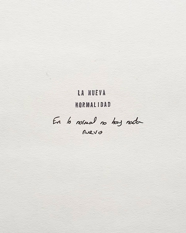 Fascinei-me muito por estas palavras: Nova Normalidade. É uma expressão muito especial, que eu acho que funciona muito bem porque é cativante, e ao mesmo tempo acho que há algo nela que é contraditório. É muito difícil que haja algo novo no normal. E ver mudar as coisas, as relações sociais, o funcionamento de um mundo pandémico, como tudo isto está em mudança...! e como tudo vai continuar mudado nos próximos anos. Ando a reflectir sobre isso,e embora seja algo que ainda quero aprofundar ao nível das ideias, estou já a fazer alguns desenhos relacionados com esse fascínio.