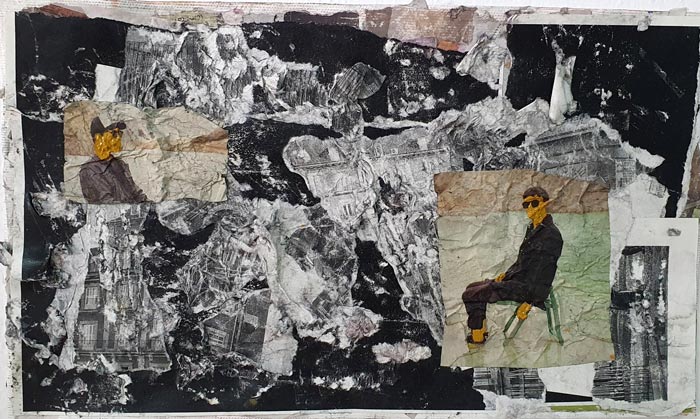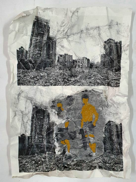 ACN: Vem tudo das séries anteriores. Há o fascínio dos papéis, antigos, já utilizados, de jornais, livros. Recontextualização, reciclagem. Está sempre presente. A partir deles comecei a fazer algumas colagens, que criam a sensação de uma paisagem destruída, quase catastrófica, que funciona muito bem na dinâmica da criação pela destruição. Nesta série essa dinâmica de destruir e construir faz todo o sentido, por isso te falava que esta nova normalidade é uma assumpção de que a realidade anterior acabou e que agora estamos a reconstruir uma nova a partir dos destroços. A estética da destruição está plasmada, assim como a acumulação; cromática, matérica... O mundo está a construir e destruir todos os dias, e nós também, a deixar o nosso rasto.