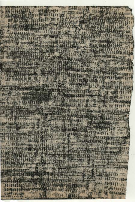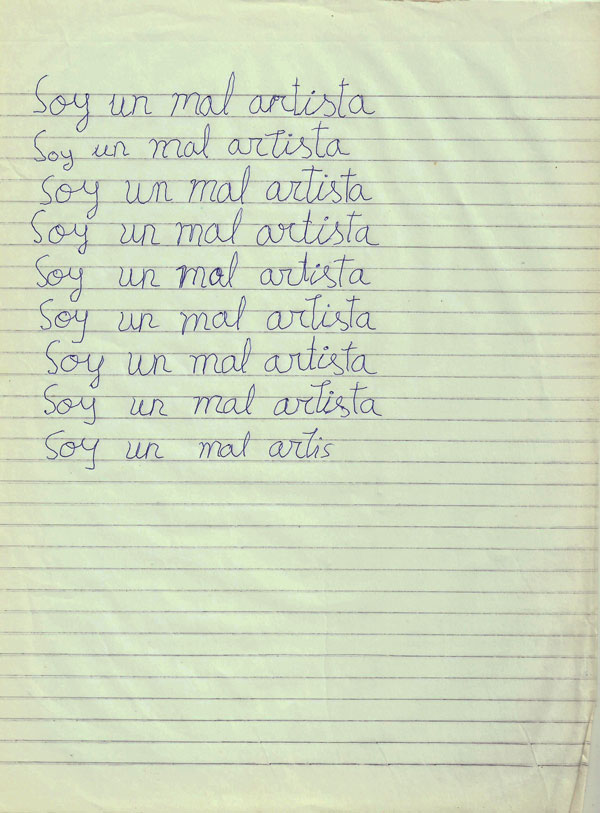 ACN: Sim. Tudo começou com uma brincadeira, tal como todos os meus trabalhos. Gosto de, não sabendo bem o que fazer, começar a modificar imagens de revistas, colocar piadas junto às imagens, às vezes até estúpidas [riso]. É nesse processo que vou descobrindo coisas, e coisas às vezes muito mais interessantes do que o que eu achava que estava a fazer no momento. Houve uma altura em que comecei a escrever a frase “Sou um mau artista” e comecei como as crianças, quando fazem algo mau e têm de escrever muitas vezes a mesma coisa para não o voltarem a fazer. É engraçado que fiquei a escrever e à nona vez cansei-me e a frase ficou a meio. Há um pouco de rebelião.